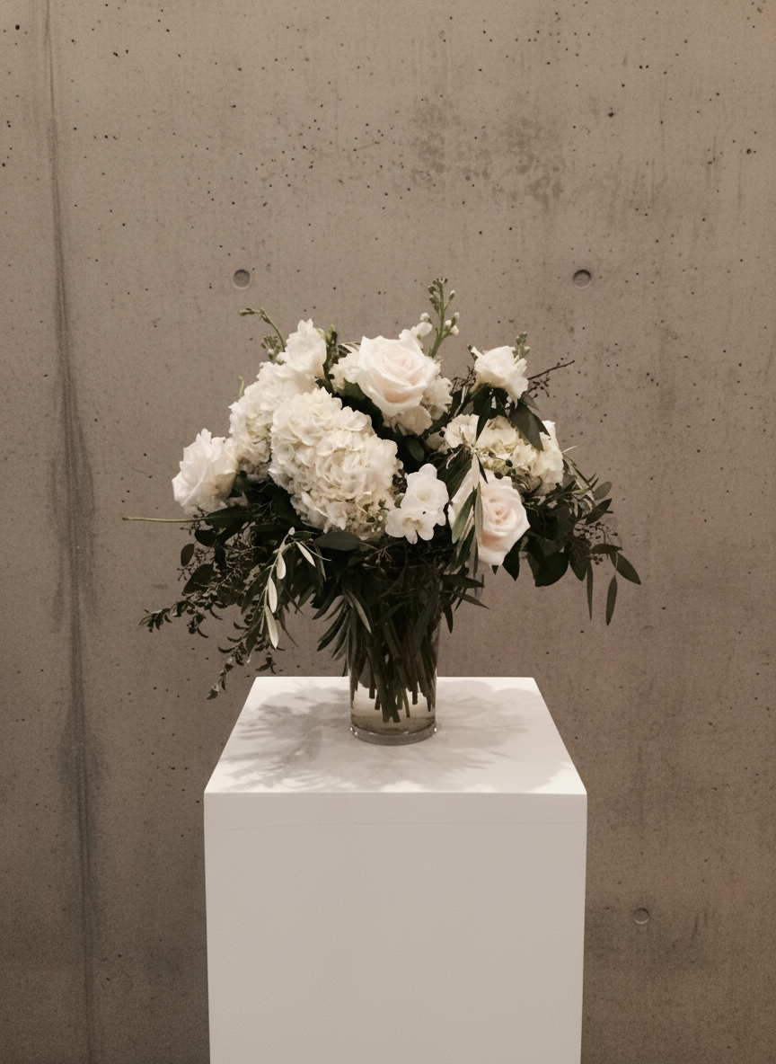This project features a collection of elegant floral arrangements, including centerpieces, pedestal displays, and table settings. The arrangements showcase a variety of flowers, including roses, greenery, and succulents, in different settings and vases.